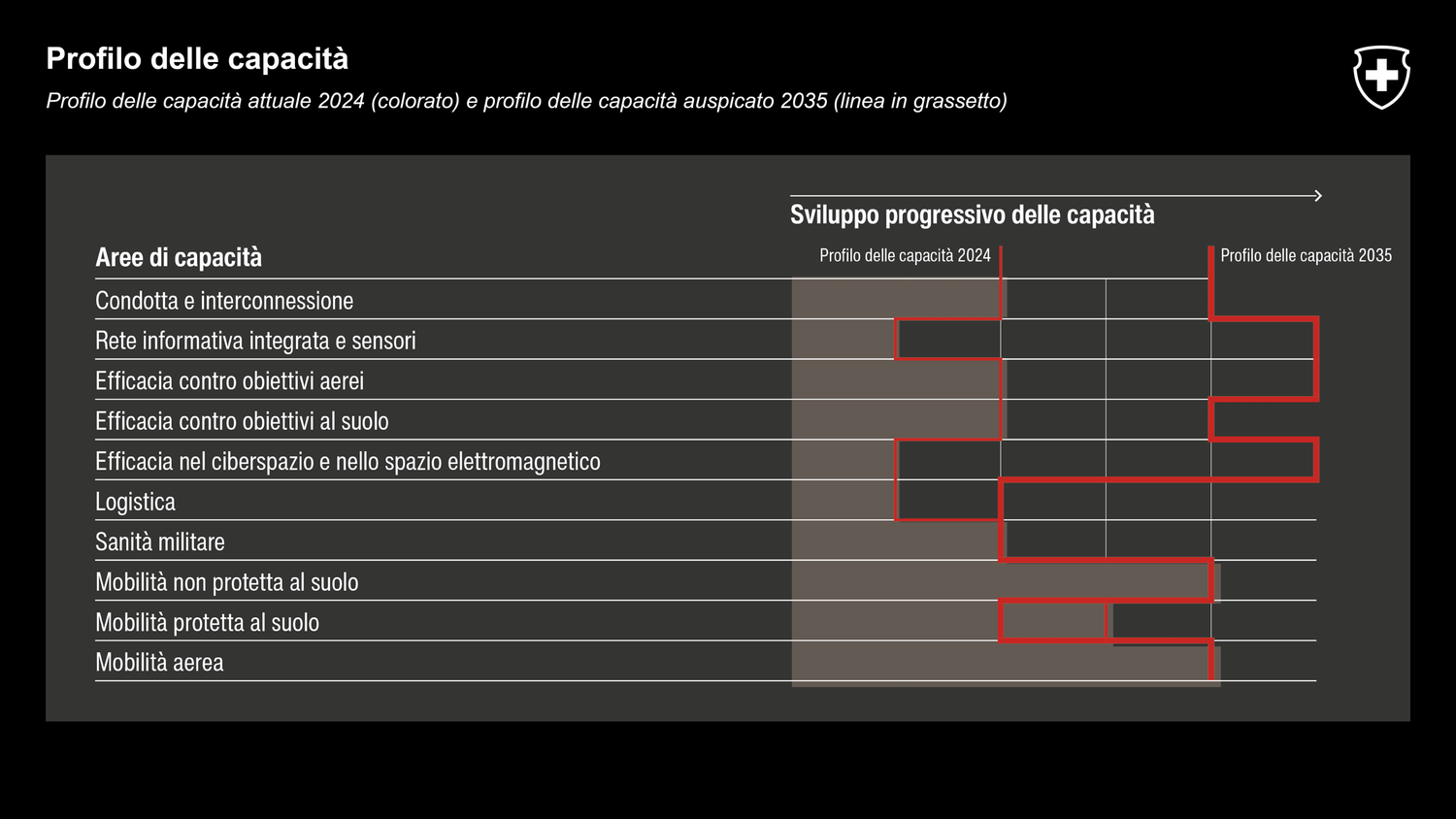 L’esercito conosce fin troppo bene i propri punti di forza e le proprie debolezze e mostra la progressiva necessità di risorse necessarie per rendere l’attuale esercito un esercito di difesa. Questo obiettivo può essere raggiunto più rapidamente con più fondi, ma richiederà più tempo con un numero ridotto di risorse. Secondo l’attuale pianificazione, la prima fase del rafforzamento della capacità di difesa per un valore di circa 13 miliardi di franchi sarà attuata non prima della prima metà degli anni 2030. Alla luce degli attuali sviluppi geopolitici, potrebbe essere troppo tardi.
