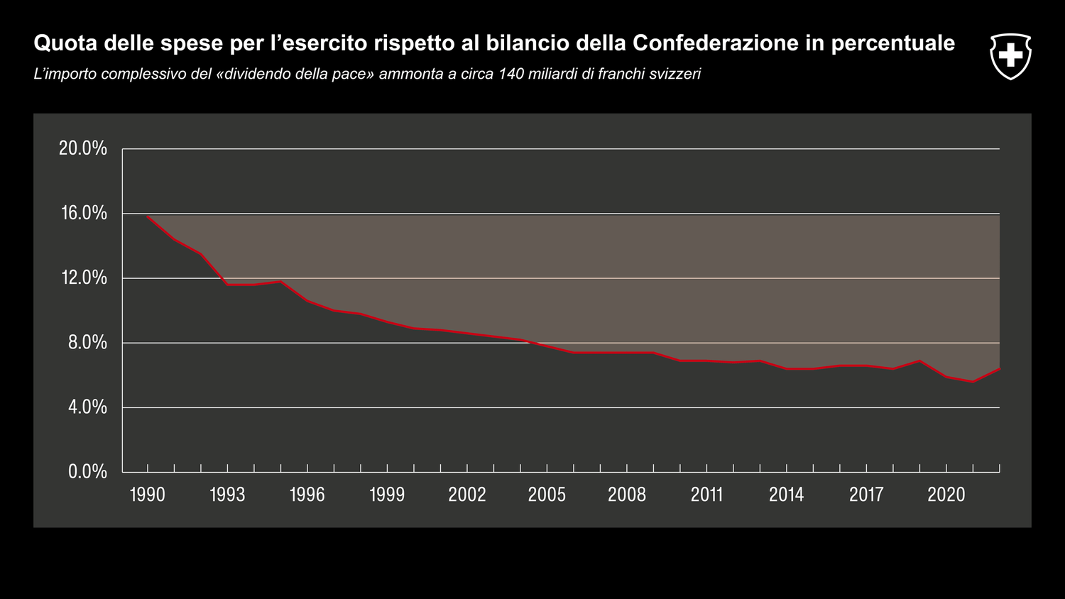 Nella percezione pubblica, questi successi mascherano le reali condizioni materiali dell’esercito. Dalla fine della Guerra Fredda le spese per l’esercito rispetto al bilancio della Confederazione sono diminuite costantemente passando da circa il 16 al sei percento. Allo stesso tempo, sono state attuate massicce misure di risparmio nell’esercito. Stime prudenti ipotizzano un dividendo della pace di oltre 40 miliardi di franchi, mentre la NZZ parla addirittura di circa 140 miliardi di franchi.