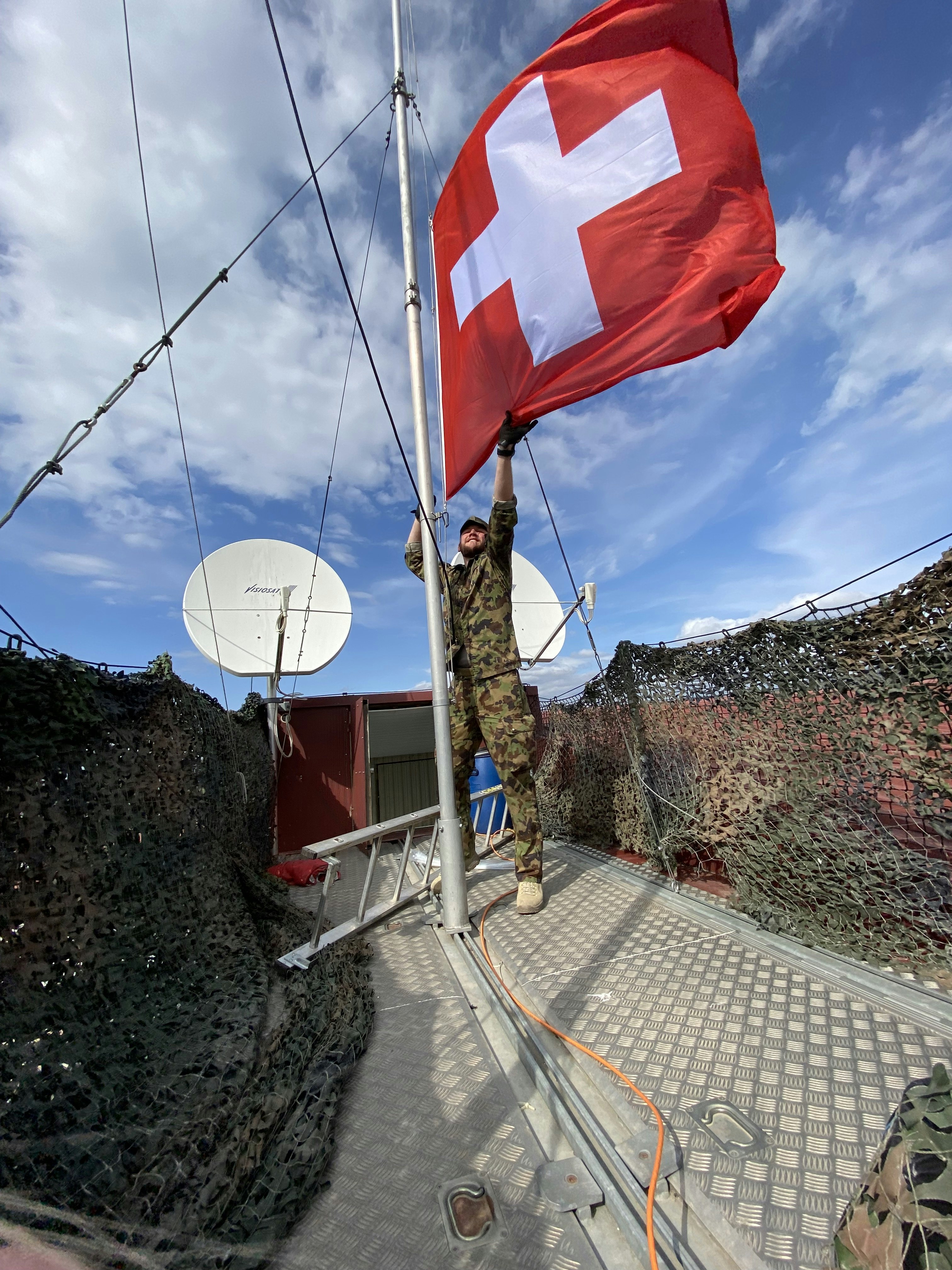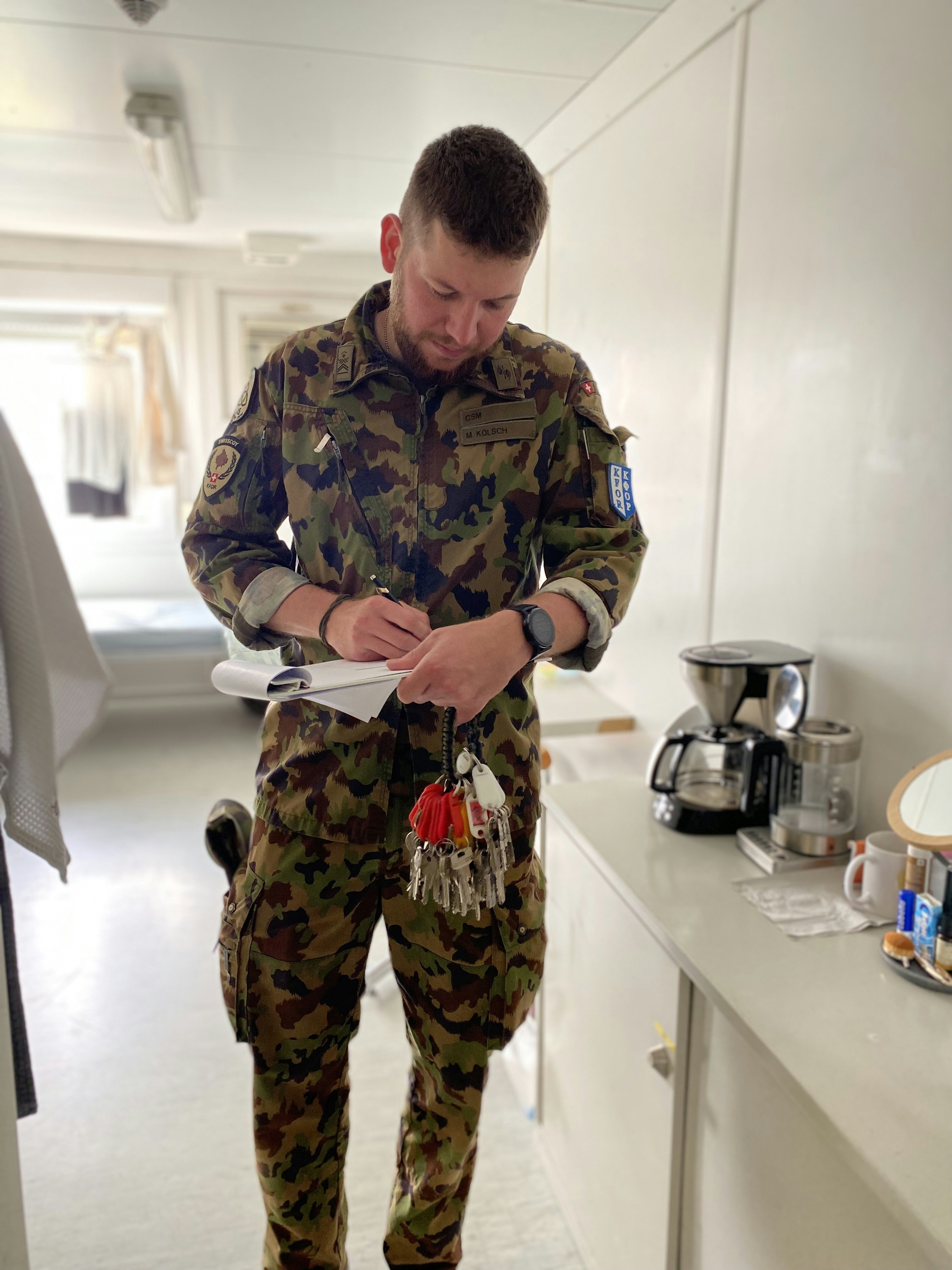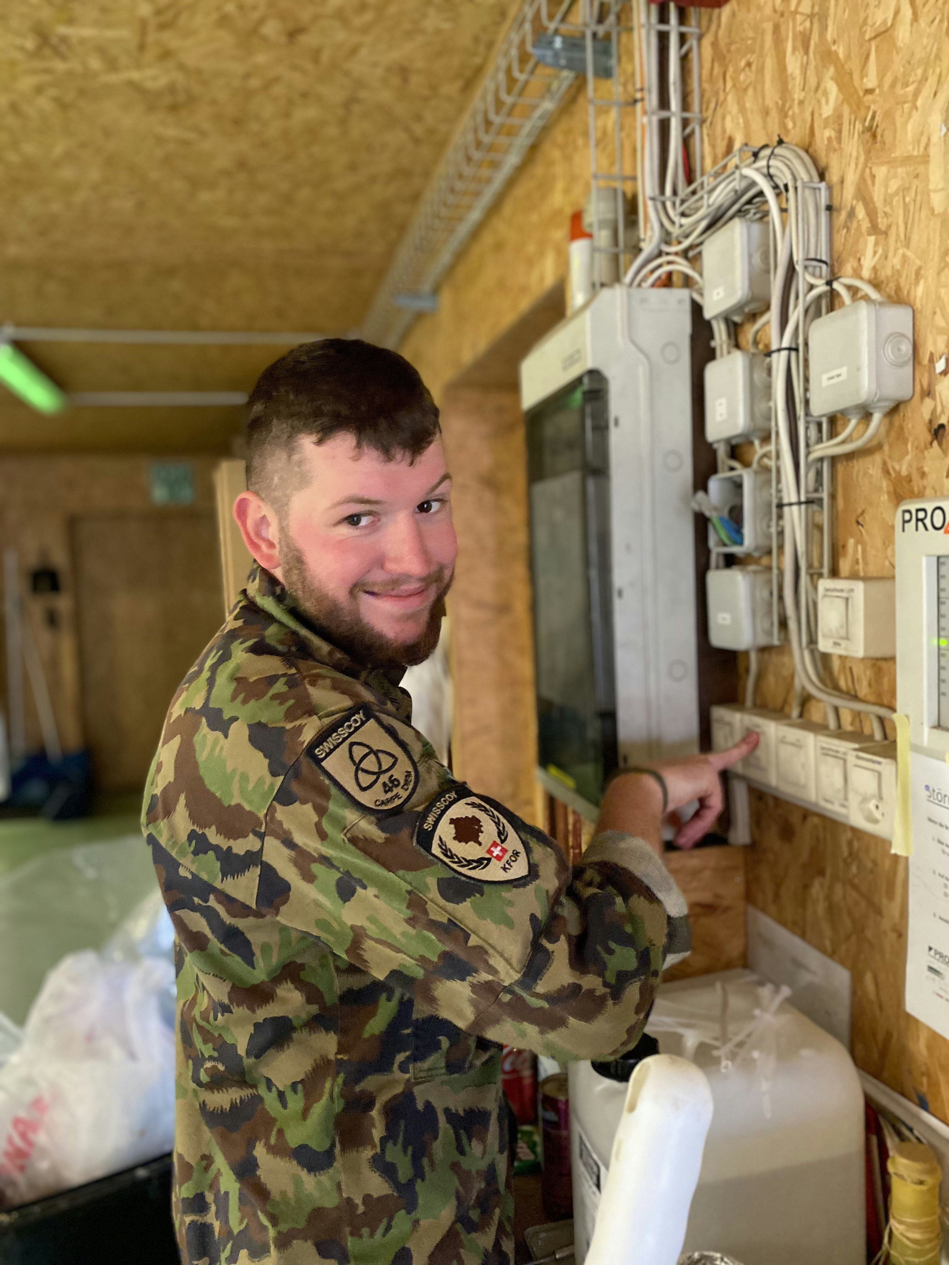 Il sgtm capo Mathias Kölsch è l’«uomo tuttofare» nel Schweizer Compound im Camp Film City (CFC), «potete chiamarmi «Camp Master», afferma Mathias Kölsch, «già durante il periodo d’istruzione ero ansioso di vedere come sarebbe stato in Kosovo. Tutti erano motivati e stavano dalla stessa parte del carro».