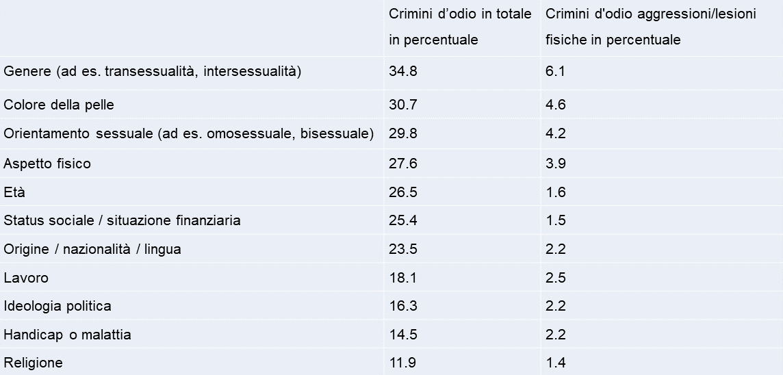 Il rischio più elevato di subire un crimine d'odio è rappresentato dalle persone che ritengono di appartenere a una minoranza di genere a causa della caratteristica corrispondente: il 34.8 % di queste persone intervistate indica di aver subito almeno una forma di vittimizzazione basata su questa caratteristica negli ultimi cinque anni.